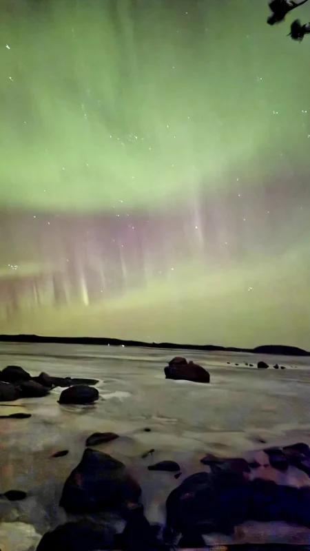 Desde la orilla del lago Saimaa, el firmamento dejó de ser un fondo estático para convertirse en un sistema vivo en constante evolución. Columnas de luz verde ascendían con fluidez desde el horizonte, desplegándose como cortinas en movimiento que respiraban sobre la bóveda celeste. A medida que la intensidad aumentaba, surgieron matices rojizos y púrpuras —poco frecuentes— que atravesaban el cielo con una precisión casi geométrica. La superficie parcialmente congelada del lago actuaba como un espejo natural, duplicando la escena y generando una percepción envolvente en la que cielo y tierra parecían fundirse.